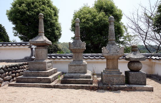 向かって左から、宝篋印塔(南北朝時代)、五輪塔(鎌倉時代後期)、宝篋印塔(鎌倉時代後期)