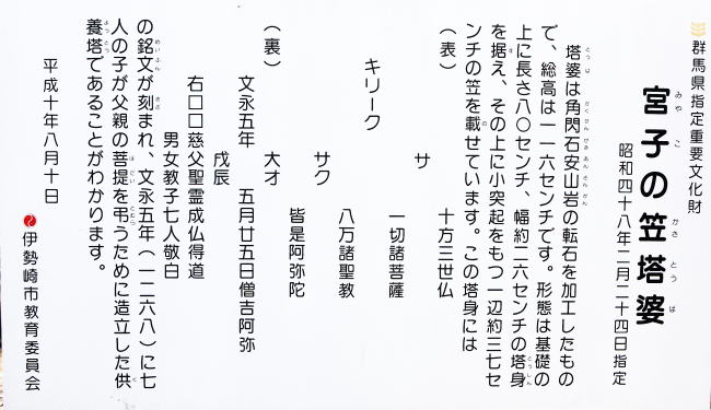群馬県では二番目に古い笠塔婆で、鎌倉時代中期、文永五年(1268)の紀年銘がある。