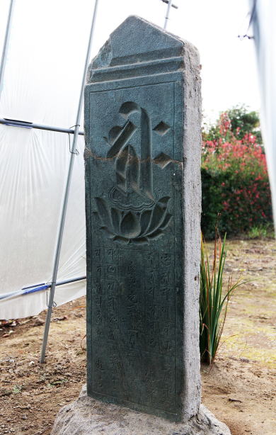 | 寺院改修の為か、山門前左手の仮設テントの中に立っていた。身部は上方に阿弥陀種子を、下方は造立趣旨と紀年銘・光明真言を刻む。 | ||
