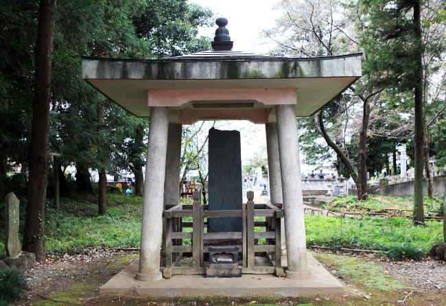 | 山門を入った境内 左手、覆屋内に安置する。板碑上部は欠損し蓮座が残り、身部に地蔵立像、下方に二十人の交名・紀年銘などを刻む。 | ||