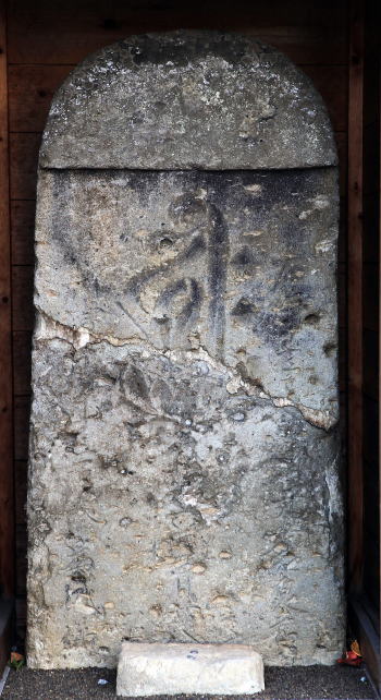 宝光寺阿弥陀種子板碑(市指定文化財、鎌倉時代中期 弘安六年 1283年、凝灰岩、高さ 175Cm)