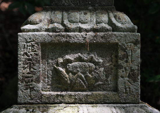 | 石塔は、普明寺の手前 約100m、山道を上ったところに立っている | 塔身、蓮華座上月輪内に金剛界四仏の種子を刻む(キリーク:阿弥陀) |