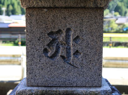 | 宝篋印塔は、大屋川に架かる浅野橋の北東側に立っている。 | 新補の塔身、金剛界四仏の種子を刻む(西面、キリーク:阿弥陀如来) |
