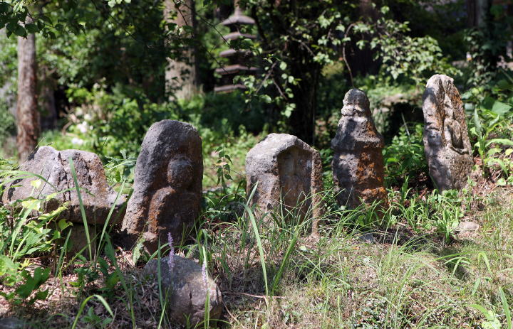明泉寺(みょうせんじ)石塔群(県指定史跡、鎌倉時代後期~室町時代 、安山岩)、地蔵石仏(向って左)と板碑(右)
