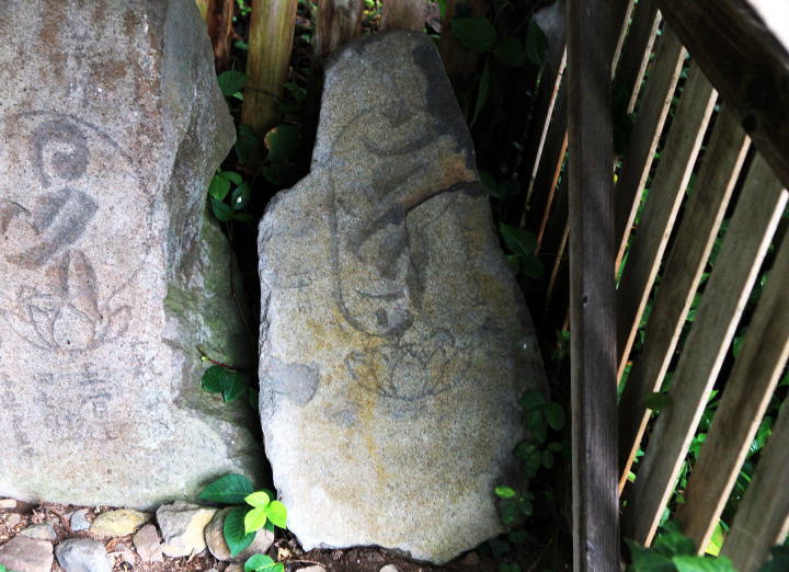 極楽寺 普賢種子石塔婆(県指定文化財、鎌倉時代後期、両輝石安山岩、高さ 74Cm 幅 36Cm 厚さ 21Cm)
