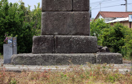 | 石塔は、三層目と四層目に段差があり、十二層目から四層目にかけて梵字らしい文字が大きく刻まれているが、判読は難しい | ||