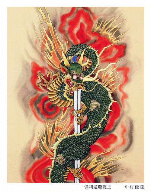 | 身部中央、線刻された不動明王の利剣にまといつく倶利伽羅竜(くりからりゅう)を種子「カン」で意匠化する。 | ||