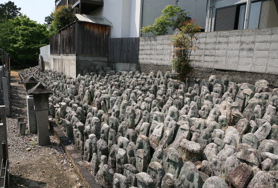 数えきれないほどたくさんの古い小石仏が寺の境界地に沿って置かれている