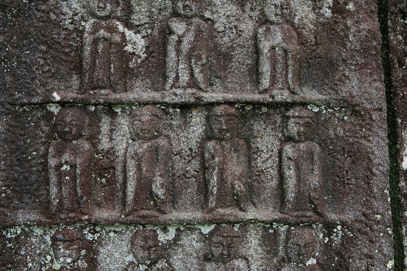 | 十六体石仏(室町〜桃山時代、花崗岩、高さ 約 112Cm)、上部に二条の帯がある板碑形になっていて、地蔵と思われる十六体を刻んでいる | ||