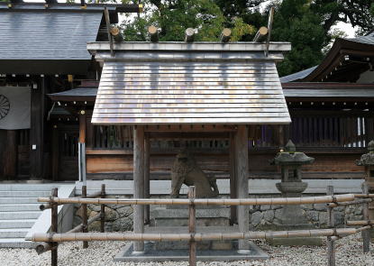 | 神明造様式の覆屋の中に置かれている吽(うん)形狛犬 | 神明造様式の覆屋の中に置かれている阿(あ)形狛犬 |