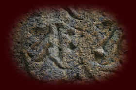 大きな月輪を陽刻し、陰刻した線で九分割、中央に金剛界大日如来、上下左右に四如来の種子を薬研彫りする