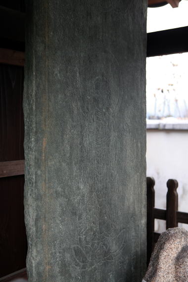 *京都市バス「仏教大学前バス停」下車、徒歩3分。東山正法寺の板石塔婆と了蓮寺(百万遍知恩寺塔頭)の板塔婆とともに京都における三板碑の一つとされている