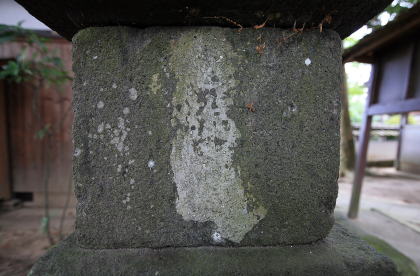 | 十三重石塔は、鳥居をくぐった奥の正面に立っている | 初層軸部(向かって左面)、三面に刻銘があるがセメントで塗り潰されている |