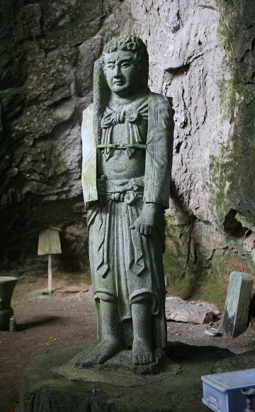 本堂裏の岩窟にセイタカ童子・矜羯羅童子の脇侍とともに安置されている。当初は、巨大な半肉彫りの地蔵磨崖仏が彫られていた