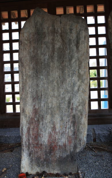 | 大塩緑ヶ丘 阿弥陀三尊図像石塔婆 (鎌倉時代中期 弘安二年 1279年、粘板岩、地上高 166Cm 幅 71Cm) |