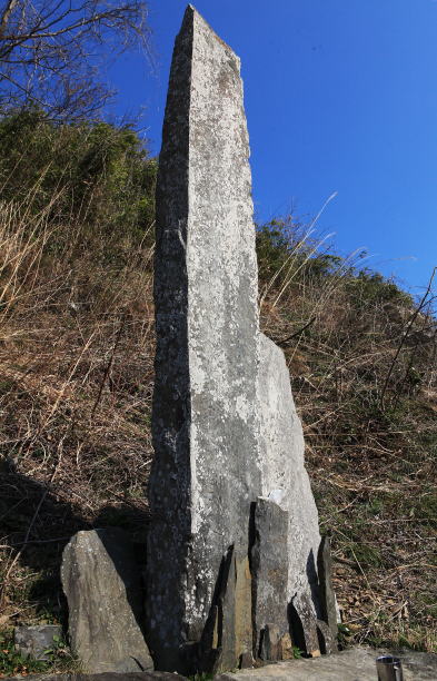 水貫山 三尊種子石塔婆(折損し二片)(南北朝時代前期 康永三年 1344年、粘板岩、上片高さ 149.5Cm 下片高さ 303Cm)