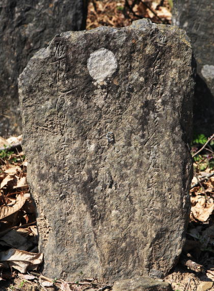 | 山口家釈迦種子石塔婆(断碑)(南北朝時代中期 貞治四年 1365年、粘板岩、高さ 83Cm 幅 31Cm 厚さ 5Cm) |