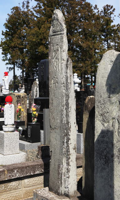 | 参道入口、板碑群三基の奥側に立つ。身部は、上方に阿弥陀三尊種子、その下に往生要集に出る偈、下方に紀年銘と願文を刻む。 | ||