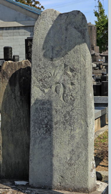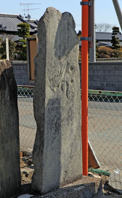 | 参道入口、板碑群三基の道路側に立つ。身部上方、長方形枠線内に梵字「バンク」、下方に偈、紀年銘、願文を刻む。 | ||