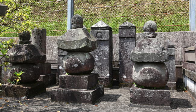 | 寺院北側の墓地 南西端の一画に立つ。中央に「南無妙法蓮華経」の七字題目、下方に造立者名と紀年銘を刻む。 | ||