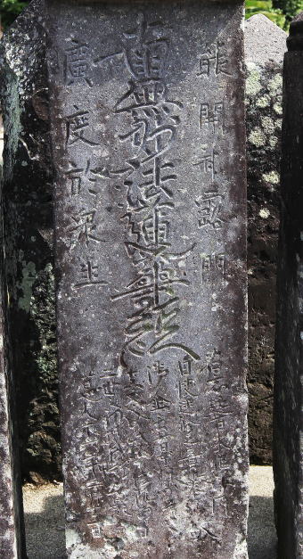 | 北壇南向き、東から三基目。中央に七字題目、その両側に法華経 化城喩品に出る偈、下方に造立趣旨と紀年銘を六行で刻む。 | ||