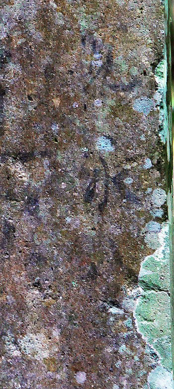 | 石塔群、永仁三年(1295)銘板碑がある窪地、手前側に立つ。上方に胎蔵界大日の種字「ア」、下方に「法印 口口翁」の名が刻まれている。 | ||