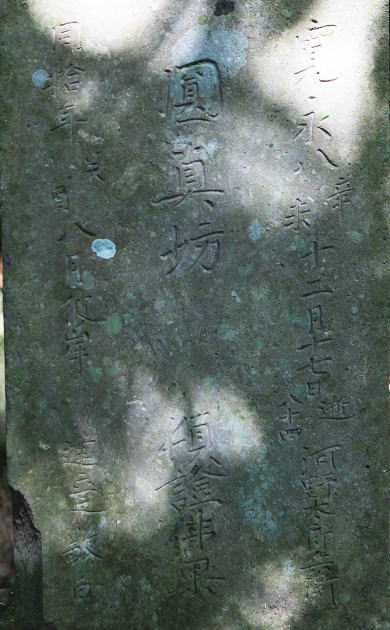 刻銘は、中央に「圓真坊 頓證佛果」、両側に「寛永八(1631)、辛未、十二月十七日、逝、八十四、河野太郎兵衛」、「同拾年(1633)、癸酉、八月彼岸、建立口 敬白」と刻まれている。