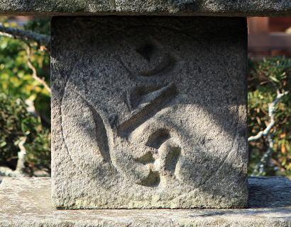 | 本堂に向かって、右側の小庭園に立っている。相輪は新補。 | 初層軸部、月輪内に金剛界四仏の種子を薬研彫する(キリーク:阿弥陀) |