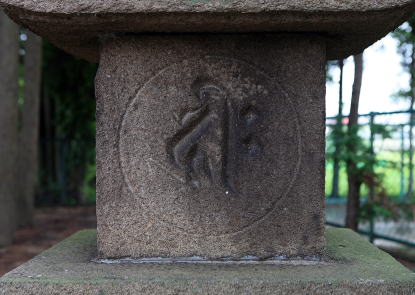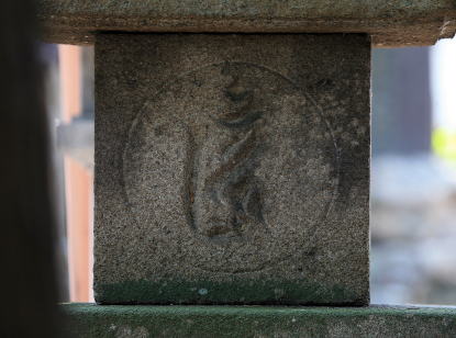 | 十三重石塔は、杵築神社の境内に立っている | 塔身、月輪内に金剛界四仏の種子を薬研彫りする(東面、ウーン:阿閦) |