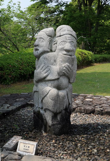 | 明日香資料館の庭に置かれている石人像(資料館は近く) | 近隣の農家に咲いていたアヤメ科の花 |