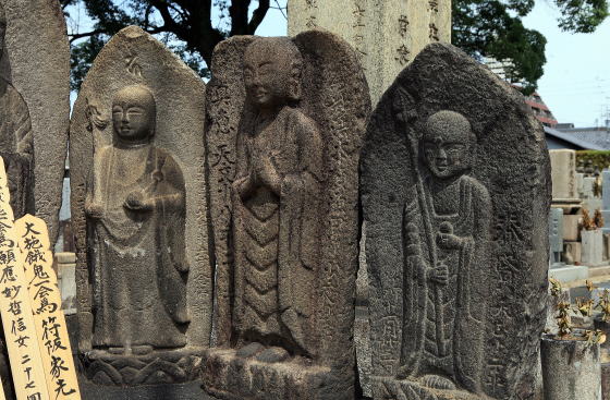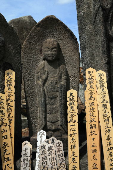 | 墓地の北東端にあり、方形の石を枠取りし 内部を彫りこんで、蓮華座上に来迎印阿弥陀立像と観音・勢至の両菩薩を厚肉彫りする | ||