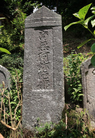 前面は地蔵石仏。中央の六字名号板碑には天文二十一年(1552)の刻銘がある。板碑の上部に地蔵と阿弥陀の坐像を刻む