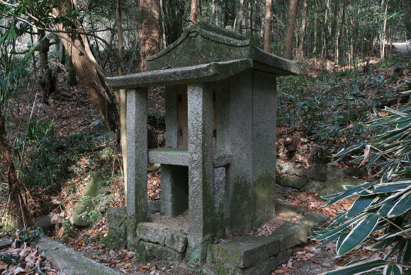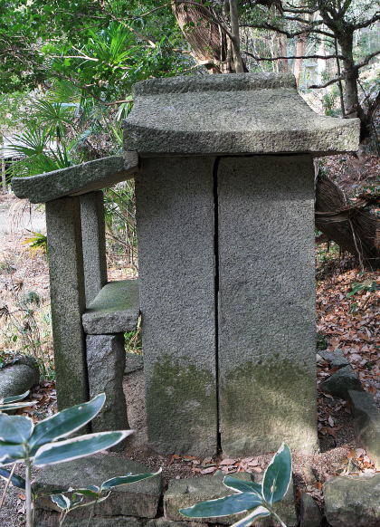| ³–ʂɓñ–{‚ÌŠp’ŒiŒü”q’Œj‚ð—§‚ÄAŒü”q•”‚ðo‚µ‚½t“ú‘¢i‚©‚·‚ª‚‚èjŽÐ“a‚ÌŒ`Ž®B‘¤–Ê Še“ñ–‡A”w–Ê ˆê–ʂ̔ÂÎiŒú‚³ 15Cm)‚ÅˆÍ‚Þ | ||