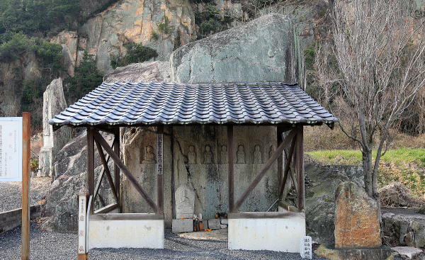 | 左から四体目の左右に刻銘がある | 花崗岩の岩壁を縦に三区に分け、各二体ずつ地蔵を半肉彫りする |