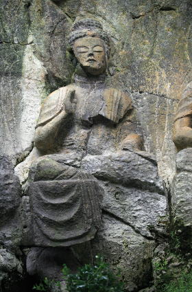 第二龕はホキ第一群の中ではもっとも古様な作ぶりで阿弥陀を中心に薬師・釈迦の三如来が並座する