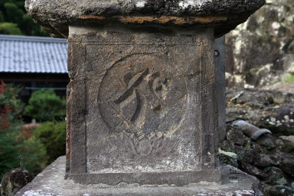 | 五重石塔は、臼杵石仏群の東側、満月寺の境内に立っている | 塔身の枠は檀上積式で、内に金剛界四仏の種子を刻む(キリーク:阿弥陀) |