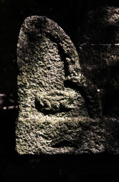 | 石塔は本堂の向かって右手、一段高くなった庭の片隅に立っている | 塔身、蓮華座上月輪内に胎蔵界四仏の種子を刻む(アー:開敷華王) |