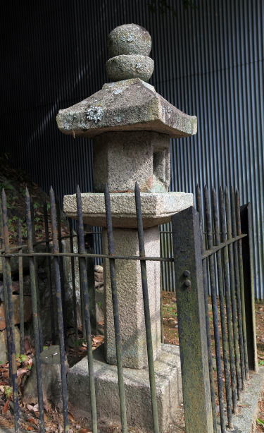| 四角型の石燈籠で、金属の柵に囲まれて境内の右手に立っている | 火袋、六角形で当初は四角形であったといわれている |