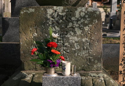 正面の三行の刻銘は、向かって右から「妙延逆修」「南無妙法蓮華経」「円真逆修」と刻まれている