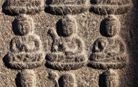 | 四段目、左から普賢菩薩・地蔵菩薩・弥勒菩薩 | 十三仏板碑は、生駒山を挟んだ大阪・奈良地方に多存する |