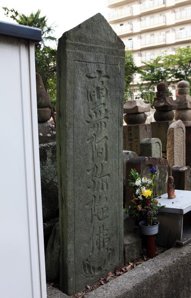 | 板碑の下部は埋め込まれている。身部は一重線の輪郭を巻き、蓮実を刻んだ蓮華座上に「南無阿弥陀仏」の六字名号を大きく刻む | ||