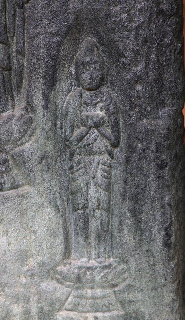 | 身部上方に頭光、身光を彫りくぼめ、蓮華座上に立つ阿弥陀如来を薄肉彫りし、観音・勢至の両脇侍は中尊より低い位置に刻む。 | ||