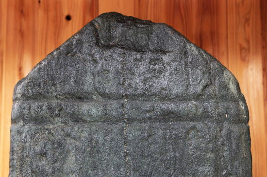 | 板碑は門内参道の左手、覆屋内中央に立っている。身部中央に阿弥陀三尊立像を薄肉彫りし、下に「建長二年(1250)」の紀年銘を刻む | ||