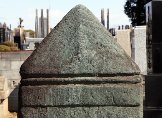 | 頭部山形の上二辺が削り込まれ、鋭利感が増している。 | 板碑、側・背面、厚さ 14Cmで重量感があり、下端は埋まる。 |