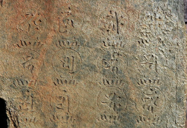 最上段に大きく刻まれた胎蔵界大日如来の種子「アーンク(五点具足)」。