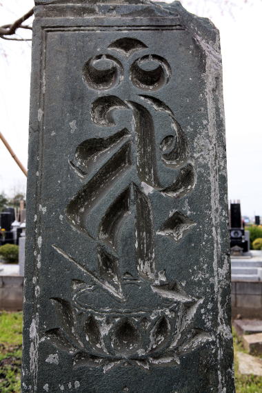板碑群六基の後列向かって右端の板碑で、塔身上部に阿弥陀如来の種子「キリーク」を蓮華座上に薬研彫する