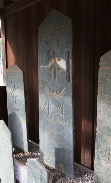 長福寺 阿弥陀三尊種子板碑(中央)(市指定文化財、鎌倉時代後期 延慶三年 1310年、緑泥片岩、高さ (114Cm?) 下幅 34Cm)