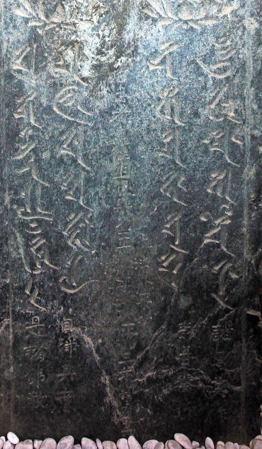 上方 左右に各二行 「光明真言」を梵字で、下方左右に各二行「法華玄義巻二の上」や「増壱阿含経」に出る 「七仏通戒偈」を刻む。