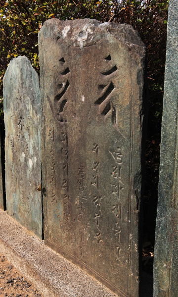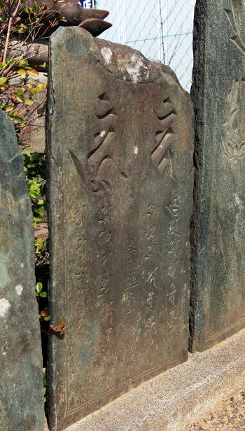 法願寺 三尊種子断碑(中央)(市指定文化財、鎌倉時代後期 嘉暦四年 1329年、緑泥片岩、高さ 67Cm 下幅 39Cm)