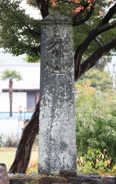 大橋堂 阿弥陀三尊種子板碑(町指定文化財、鎌倉時代末期 正慶二年 1333年、緑泥片岩、高さ 293Cm 下幅 67Cm)